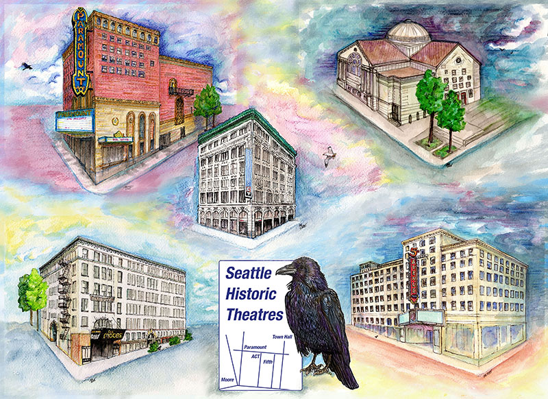 Giclee archival print of digital compilation from water media originals, approx. 11” x 15” image size. Printed on cold press archival paper.