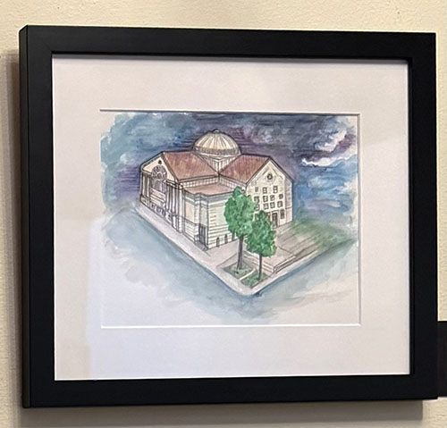 Original watercolor, pencil & pen on paper, 9″ x 7″ approx. image size. On cold press archival paper mounted on acid free materials. Framed with simple black frame and museum glass.